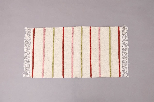 • Design : Fond écru décoré de lignes verticales en relief (style tresses) aux nuances de rouge brique, vert olive et rose pastel.